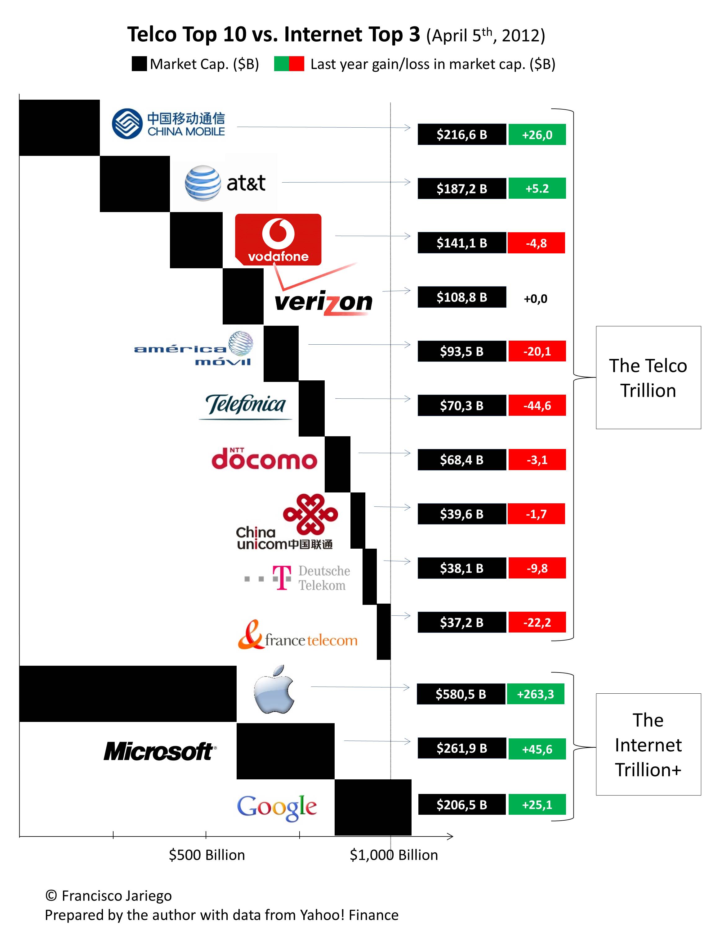 As of today, April 5th, 2012, the aggregated market value of the top 10 telecommunication service providers is $1 Trillion, just a little less than the aggregated value of the top 3 internet companies (calculation based on data published by Yahoo! Finance)