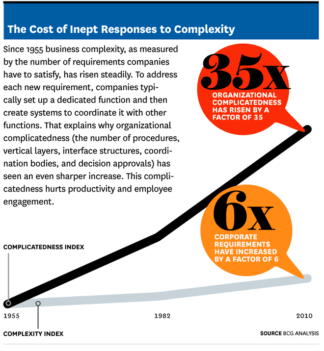 The survey results show that over the past 15 years, the amount of procedures, vertical layers, interface structures, coordination bodies, and decision approvals needed in each of those firms has increased by anywhere from 50% to 350%. According to our analysis over a longer time horizon, complicatedness increased by 6.7% a year, on average, over the past five decades.