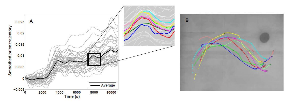 Financial markets works in a similar way. In markets, the state of the economy is monitored by a large number of investors who quickly broadcast any changes to each other via price movements. By synchronizing prices, HFT allows the “many eyes” of different investors to function as one coherent group, which results in price trajectories that look like the motions of schooling fish (See Figure)