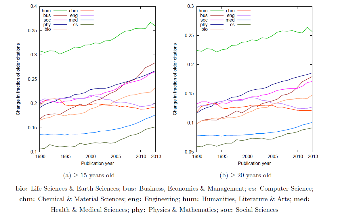 How often are older articles cited in scholarly papers and how is this changing over time? In the last two decades we have seen significant changes in scholarly communication. Scholarly journals have largely moved on-line, scientific publishers have digitized their archives to make the entire history of their publications available, and search services now index the entire text of articles instead of just abstracts and keywords. These changes should have made it easier for researchers to find the most relevant articles for their work regardless of the age of the articles. And in fact, the impact of older articles has grown substantially over 1990-2013.