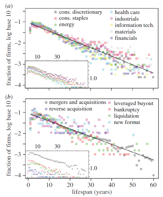 (1) Daepp, Madeleine I. G., Marcus J. Hamilton, Geoffrey B. West, and Luís M. A. Bettencourt. “The Mortality of Companies.” Journal of The Royal Society Interface 12, no. 106 (May 6, 2015): 20150120. doi:10.1098/rsif.2015.0120.
