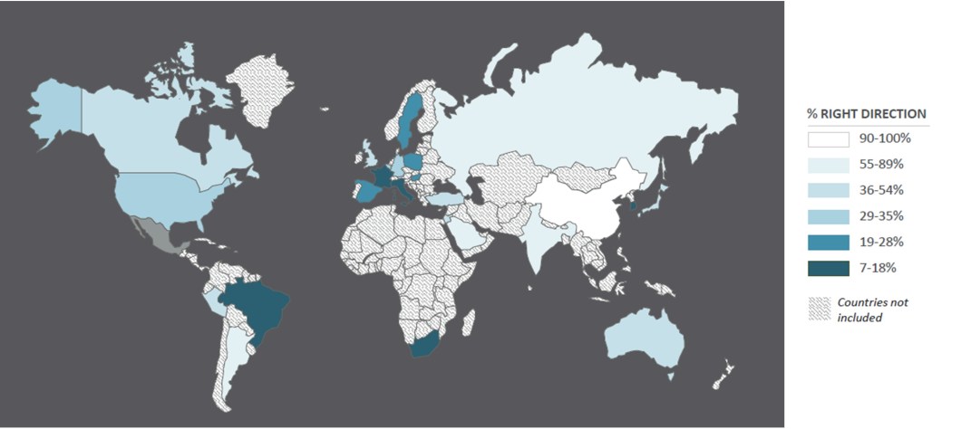 Climate change is not such a high concern globally, ranking 15th with only 8% worried about it. Interestingly, China is the country most concerned (23%) about it. Which brings me to what I find most striking (see figure above): the comparison across countries/regions, with the “West” clearly on the wrong truck, while people in China (90%), Saudi Arabia (80%), India (76%), and even Russia (76%) think their countries are going in the right direction!