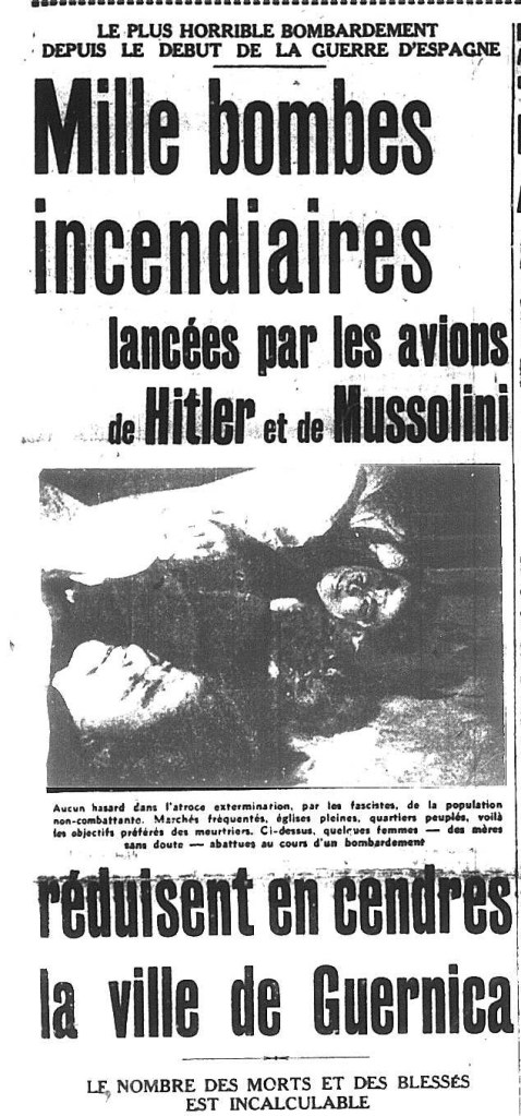 The news appeared in the Paris newspaper Ce Soir, and the French communist daily, L’Humanite, on Wednesday, 28 April 1937, where Pablo Picasso likely read about the massacre. (News travelled slowly in those days.) He was living in Paris and working on a painting commissioned by the Spanish Republican government that would be exhibited at the Spanish Pavilion at the Paris International Exposition.
