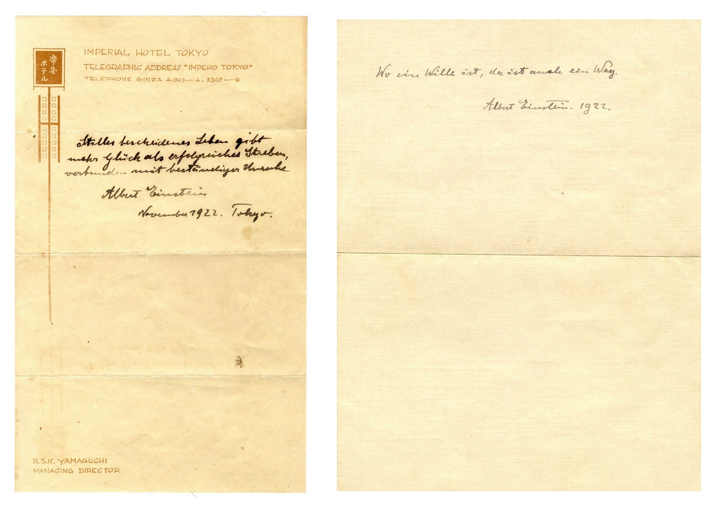 He was impressed but also a little embarrassed by the publicity he received and while he was staying at the Imperial Hotel in Tokyo he tried to record his thoughts and feelings on paper. When a messenger came to his room to give him something, Einstein did not have a tip available, and he decided to make the most of his new exalted status and give the messenger two of his writings. When he gave him the articles he told the messenger to keep them, as their future value may be much higher than a standard tip.