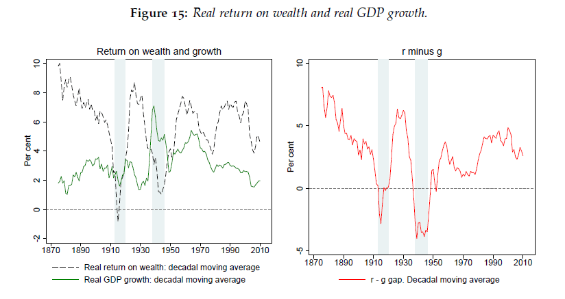 Even calculated from more granular asset price returns data, the same fact reported in Piketty holds true for more countries and more years, and more dramatically: namely “r >> g.” In fact, the only exceptions to that rule happen in very special periods: the years in or right around wartime. In peacetime, r has always been much greater than g. This feature of the data poses a conundrum for the battling views of factor income, distribution, and substitution in the ongoing debate