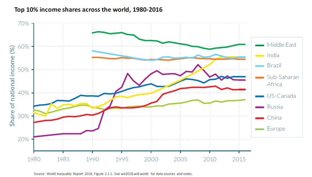 - Globalisation has led to a rise in global income inequality, not a reduction. Since 1980, income inequality has increased rapidly in North America, Russia and Asia, grown moderately in Europe, and stabilised at an extremely high level in the Middle East, sub-Saharan Africa, and Brazil. At global (aggregated) level, inequality has risen sharply, despite strong growth in China.