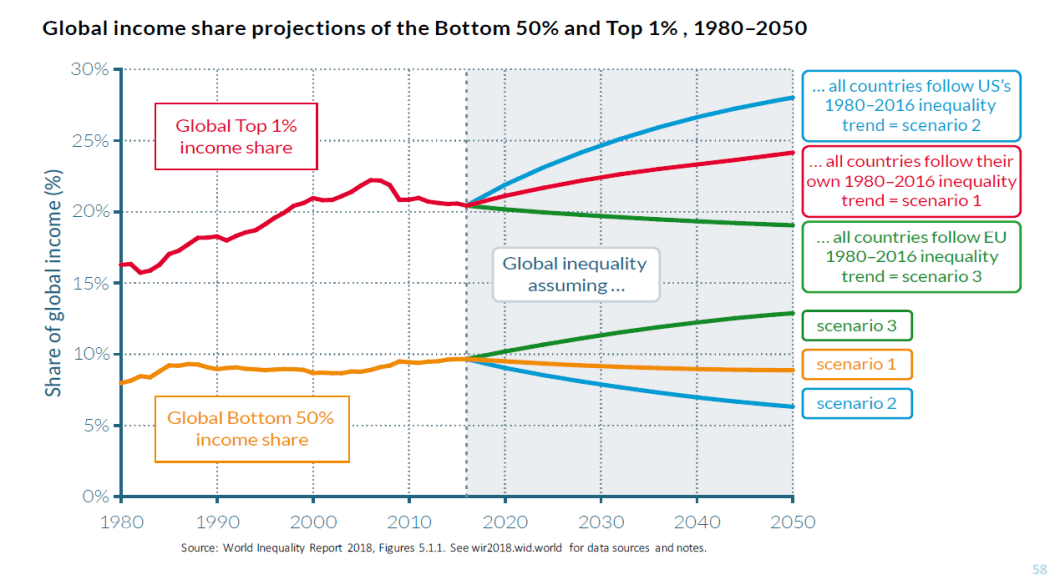 - Conversely, if all countries were to follow the relatively low inequality growth trajectory followed by Europe since 1980, the global top 1% income share would decrease to 19% by 2050, while the bottom 50% income share would increase to 13%.