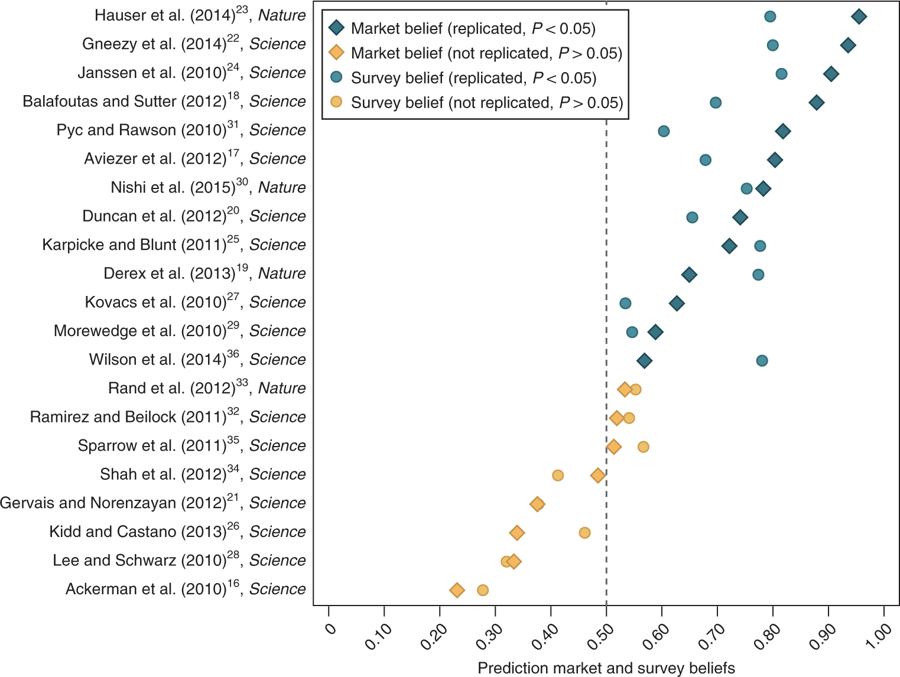 (1) Camerer, Colin F., et al. ‘Evaluating the Replicability of Social Science Experiments in Nature and Science between 2010 and 2015’. Nature Human Behaviour, Aug. 2018, p. 1. http://www.nature.com, doi:10.1038/s41562-018-0399-z.