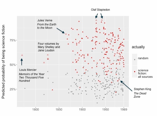 Invocations of scale (“vast,” “far,” “larger”) are very characteristic of science fiction, as are large numbers (“thousands”). Self-conscious references to the “earth” and to things that are “human” tend to accompany “creatures” from which humanity may be distinguished, and the pronoun “its” is common, since we often confront actors who lack an easily recognized human gender. This is not by any means an exhaustive description of the genre — just a taste of the model.