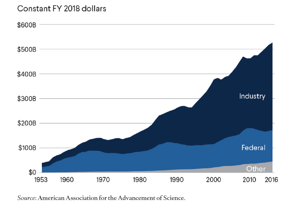 Although private-sector investment has risen over the past three decades, it is no substitute for federally funded R&D that targets national strategic concerns.