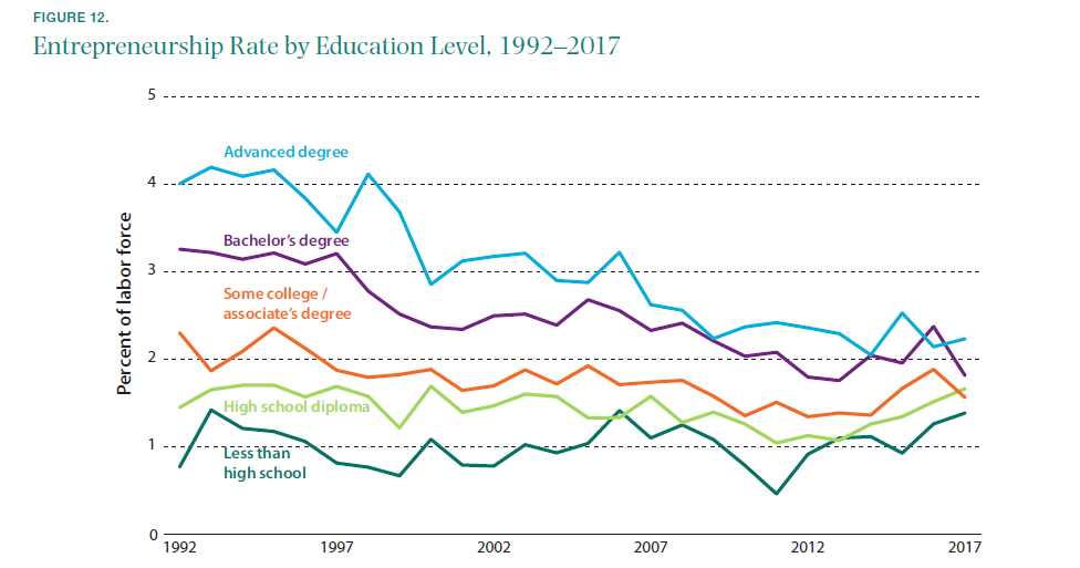 The employment share of young firms has decreased by more than one-third since 1987. Businesses are taking longer to form, while business applications have declined. The entrepreneurship rate has fallen by almost half for workers with a bachelor’s degree.