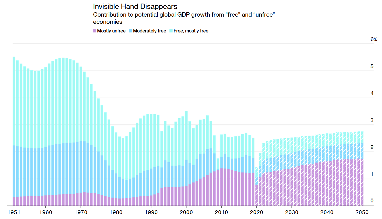 Bloomberg Economics has used a growth accounting framework—adding up the contributions of labor, capital and productivity—to forecast potential GDP through 2050 for 39 countries, from the U.S. to Ghana. The results suggest that a remarkable period of stability, stretching from the end of World War II through to the early 21st century, is coming to an end. The centre of economic gravity is shifting