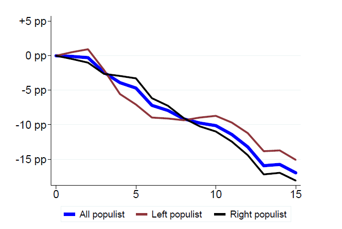 Protectionist trade policies, unsustainable debt dynamics, and the erosion of democratic institutions stand out as commonalities of populists in power, across region, era, and ideology. Populists typically deliver on their often anti-foreign rhetoric, enacting policies of economic nationalism and protectionism. We also find a significant decline in judiciary independence, election quality, and press and media freedom, damaging the innovation friendly economic environment of democracies (Acemoglu 2019). The fact that populist often change the institutional “rules” of the game helps explain why, despite their subpar economic performance, populists typically do not quickly “self-destruct”. Our new database of populist leaders opens up many new avenues for research on populism, its drivers and consequences.