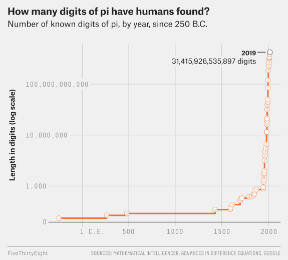 On March 14, 2019, Google announced that one of its employees, Emma Haruka Iwao, had found nearly 9 trillion new digits of that number, setting a new record. And less than a year later, on 29 January 2020, Timothy Mullican raised the bar to 50,000,000,000,000 digits, the most accurate value of your number so far. But abandon all hope. You would need all the energy in the universe to compute every single digit in its representation. A single number! (and people worried about blockchain π