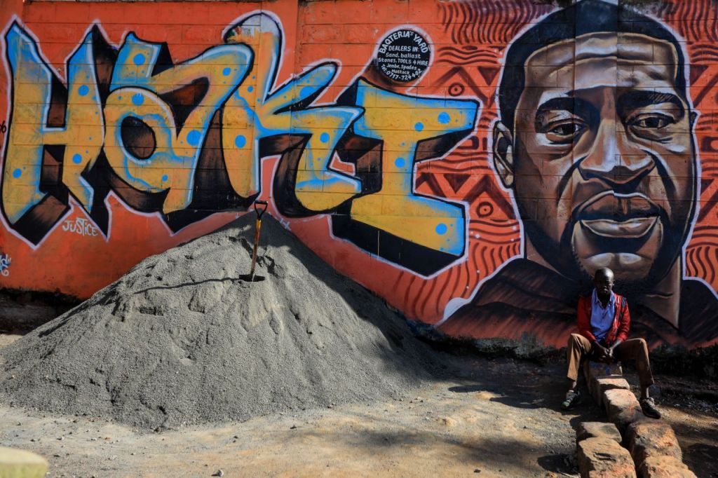 (1) Mandatory Credit: Photo by Daniel Irungu/EPA-EFE/Shutterstock (10669277a) A Kenyan man (R) seats next to a graffiti in memory of the late US George Floyd painted on a perimeter wall by a group of Kenyan graffiti artists in support of the Black Lives Matter movement as their way to protest against the Police brutality in Kenya and USA in the Kibera slums in Nairobi, Kenya, 04 June 2020. Protesters across the globe have been holding protests to express their feelings regarding the death of 46-year-old George Floyd while in police custody. A bystander’s video posted online on 25 May appeared to show George Floyd, 46, pleading with arresting officers that he couldn’t breathe as an officer knelt on his neck, in Minnesota, USA. The unarmed black man later died in police custody. Police brutality mural in support of Black Lives Matter in Nairobi in wake of George Floyd’s death, Kenya – 04 Jun 2020