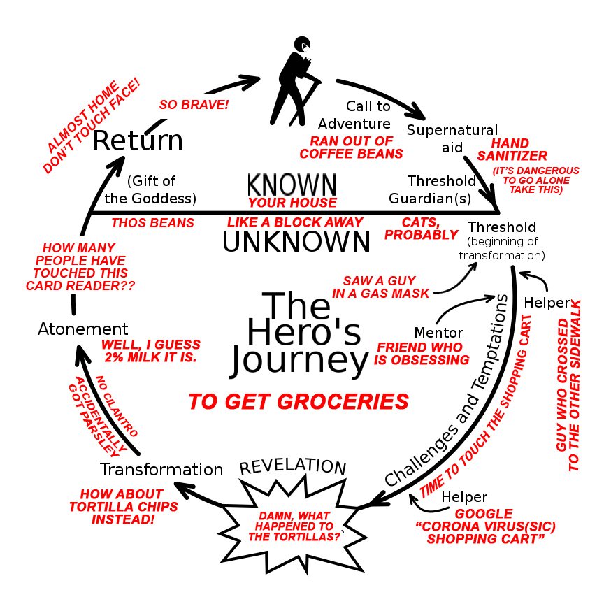Featured Image: Mike Mccubbin, via Jenniffer Ouellette & Boing Boing: Getting groceries during COVID-19 maps perfectly onto Joseph Campbell’s Hero’s Journey.