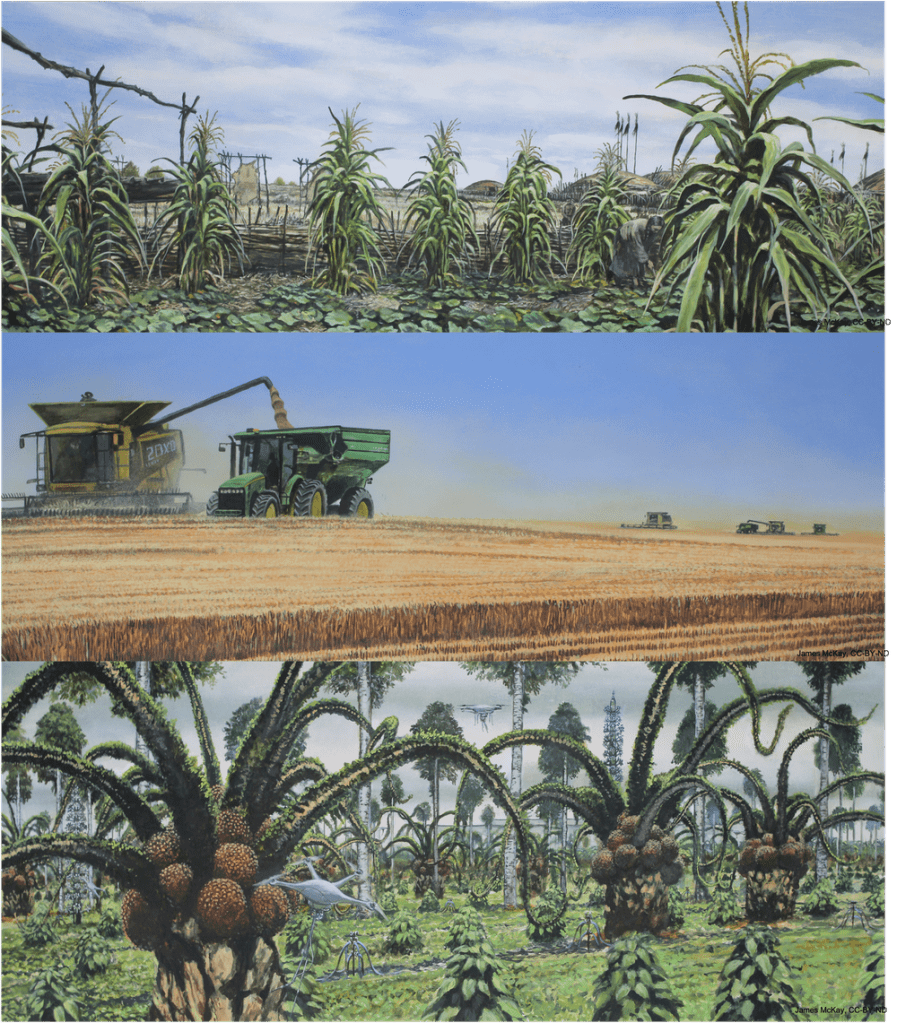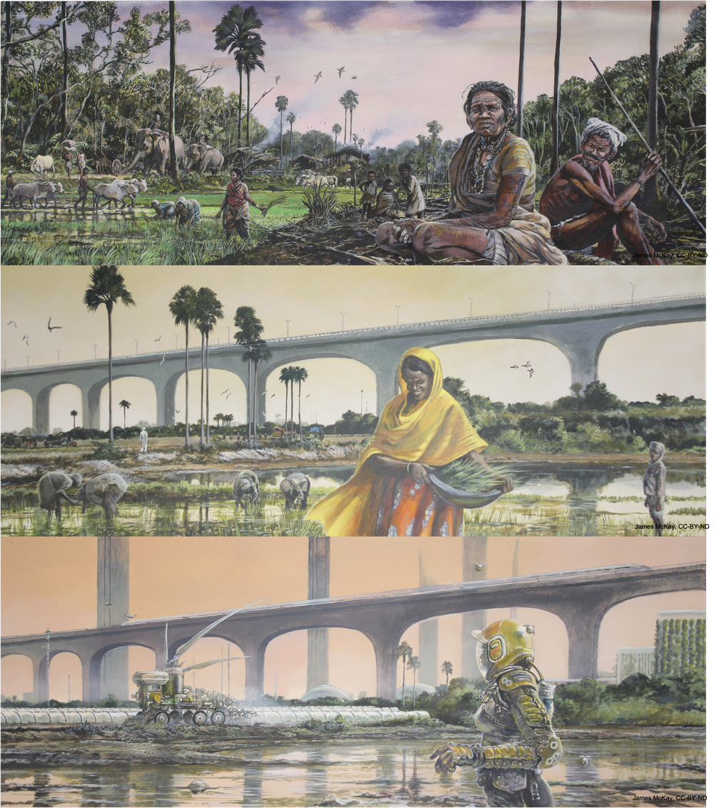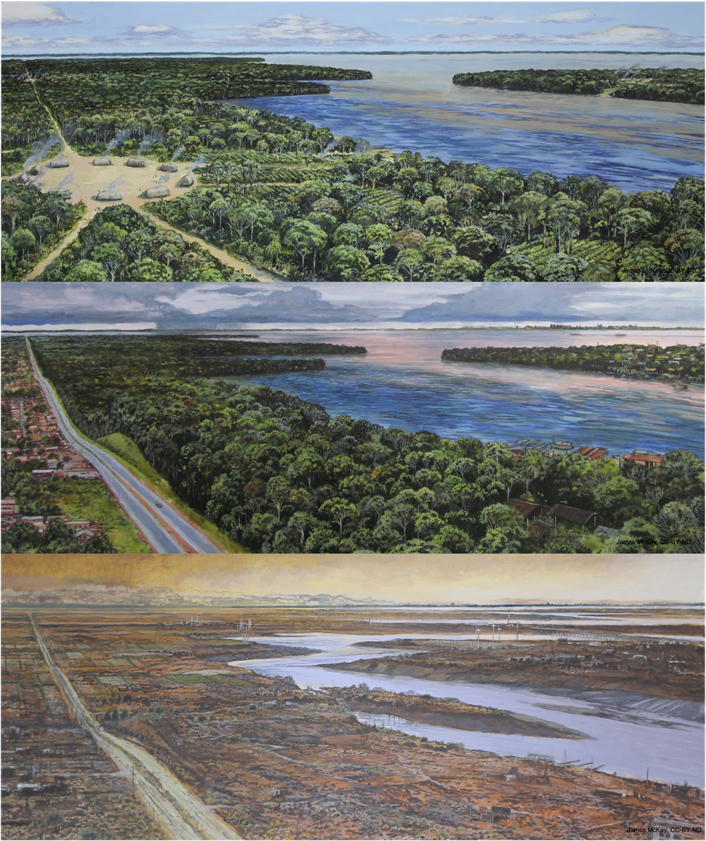 To make their case more compelling they have used their projections and diverse research expertise to inform a series of nine paintings covering a thousand years from 1500 to 2500 CE, in three major regional landscapes: the Amazon, the Midwest United States and the Indian subcontinent.