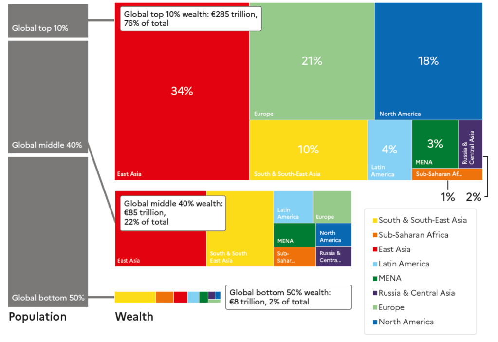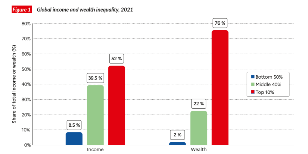 The richest 10% of the global population currently takes 52% of global income, whereas the poorest half of the population earns 8.5% of it. Global wealth inequalities are even more pronounced than income inequalities. The poorest half of the global population barely owns any wealth at all, possessing just 2% of the total. In contrast, the richest 10% of the global population own 76% of all wealth.