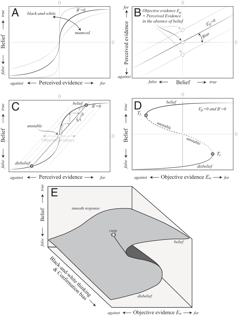 Even if objective evidence changes, this will usually only have minor effects on the perceived evidence and, therefore, on the belief. However, if the cumulative objective evidence changes strongly enough for the unstable equilibrium to touch the belief equilibrium, a tipping point (T2) is reached where stability of the belief is destroyed, and the belief will be abandoned. Analogously, in T1, the disbelief becomes unstable.(D).