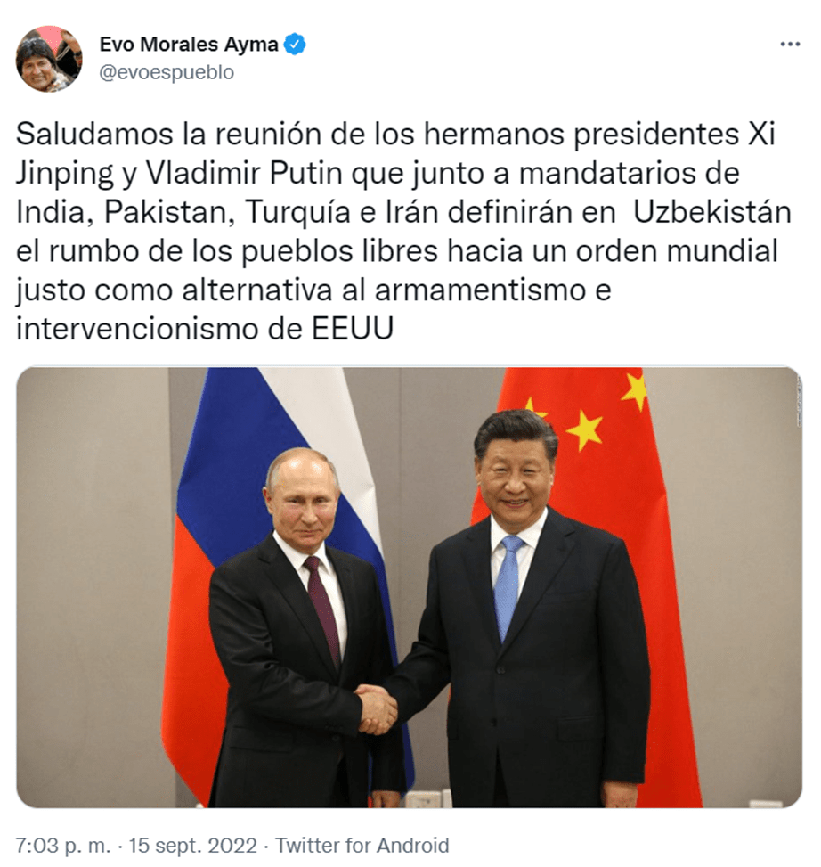 Evo Morales: “We welcome the meeting of the brother presidents Xi Jinping and Vladimir Putin who, together with the leaders of India, Pakistan, Turkey and Iran, will define in Uzbekistan the course of the free peoples towards a just world order as an alternative to US arms race and interventionism.”