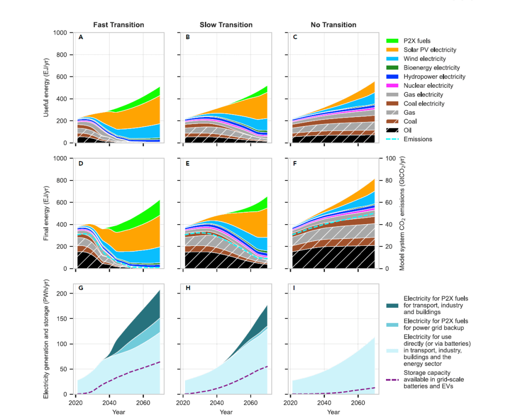 The three columns in the figure above represent the three energy system scenarios running from 2021 to 2070, Fast Transition, Slow Transition, and No Transition: