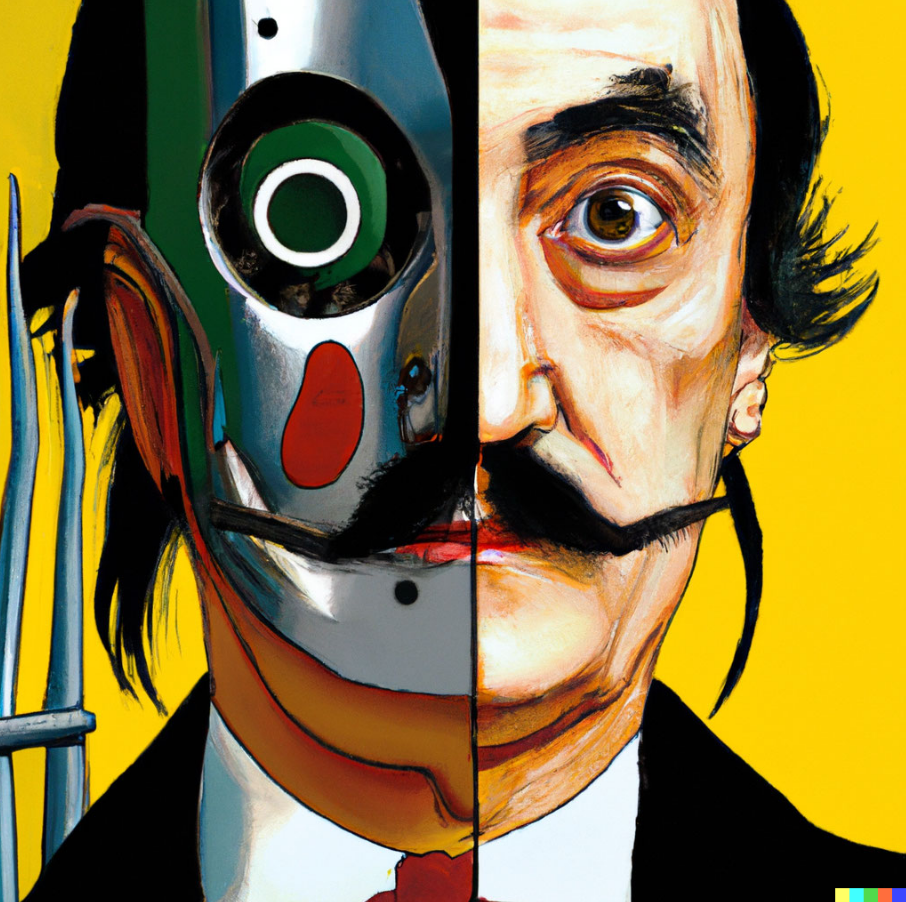 Featured Image: Vibrant portrait painting of Salvador Dalí with a robotic half face, by DALL-E. (of which there are of course countless variations)