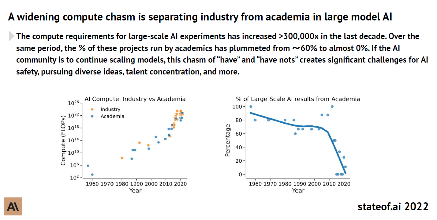 And this is my favourite takeaway: Universities are a hotbed for AI spinouts, but a widening compute chasm is separating industry from academia in large model AI. Almost 0% of AI work is done in academia.