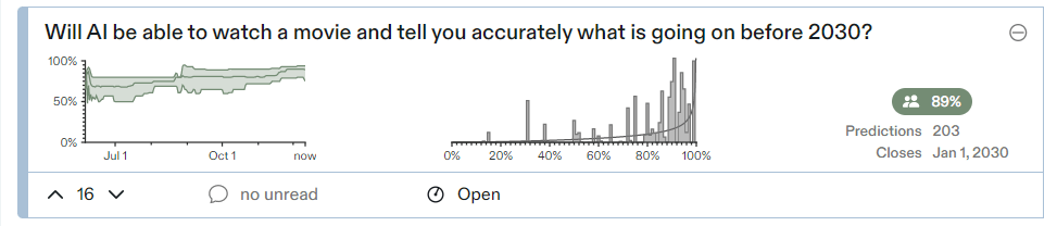 Will AI be able to watch a movie and tell you accurately what is going on before 2030? Metaculus Community Prediction: 89%