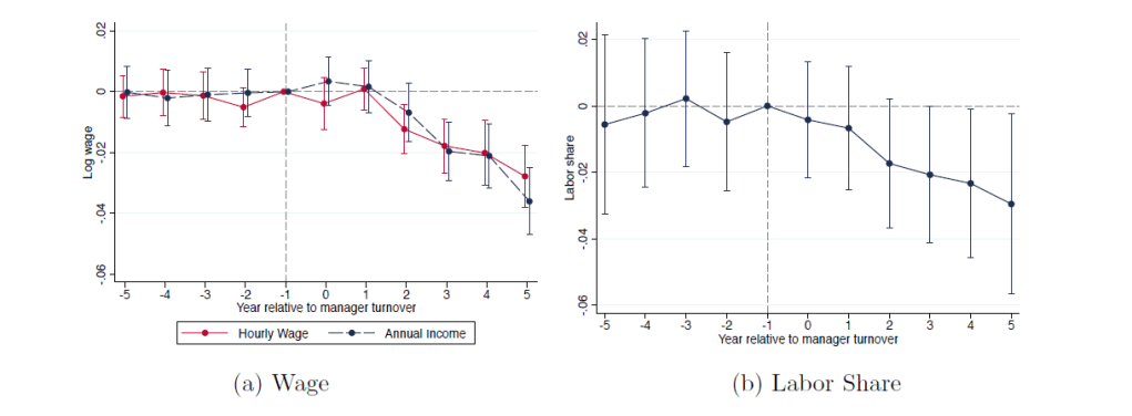 Managers with a business degree (“business managers”) reduce their employees’ wages. Within five years of the appointment of a business manager, wages decline by 6% and the labour share by 5% in the US, while both wages and labour share decline by 3% in Denmark.