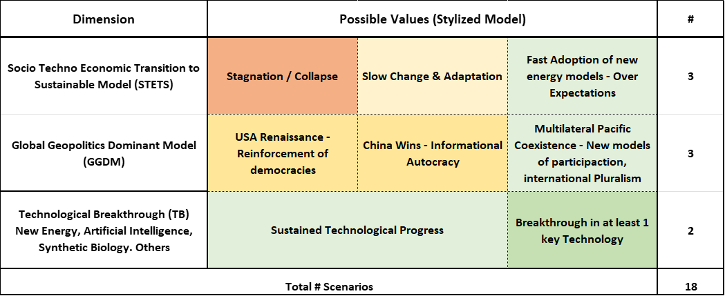 With three main possible paths for each of the two first dimensions (STETS and GGDP) and only two (yes/no) for the possibility of a single technological breakthrough (similar to the transistor or antibiotics in the XX century) we end up with (3 x 3 x 2 =) 18 possible (not all equally probable) scenarios.