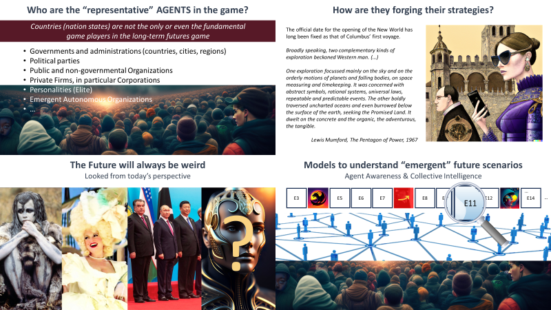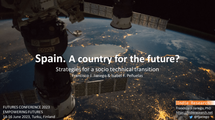 Our objective is to understand the key forces driving change, and the most important factors and levers driving the evolving socio techno economic transition. We use our country, Spain, as a test and showcase, but our objective is to outline an holistic model inspired by scenario planning and game theory to study future adaptive strategies available to meaningful players/agents in the futures game over the next 25-50 years.