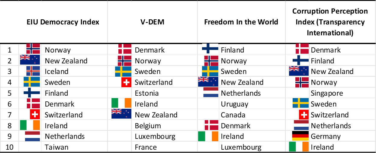 Here are the numbers based on four well established indexes on democratic institutions and practices, freedom and corruption.