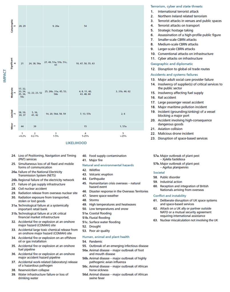 Risk in NRR are assessed as ‘reasonable worst-case scenarios’. These scenarios are not a prediction of what is most likely to happen, instead they represent the worst plausible manifestation of that particular risk. The risks that meet the threshold for inclusion in the NRR would have a substantial impact on the UK’s safety, security and/or critical systems at a national level.