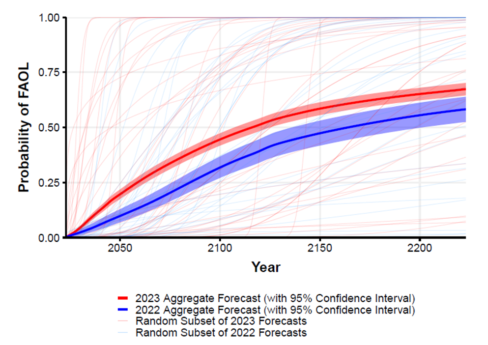 The aggregate 2023 forecast predicted a 50% chance of FAOL by 2116, down 48 years from 2164 in the 2022 survey