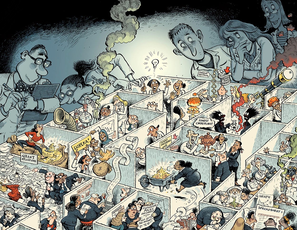 Free from the demands of corporate overlords, research focuses more on satisfying geeks’ curiosity or boosting citation counts than it does on finding breakthroughs that will change the world or make money. In moderation, research for research’s sake is no bad thing; some breakthrough technologies, such as penicillin, were discovered almost by accident. But if everyone is arguing over ho