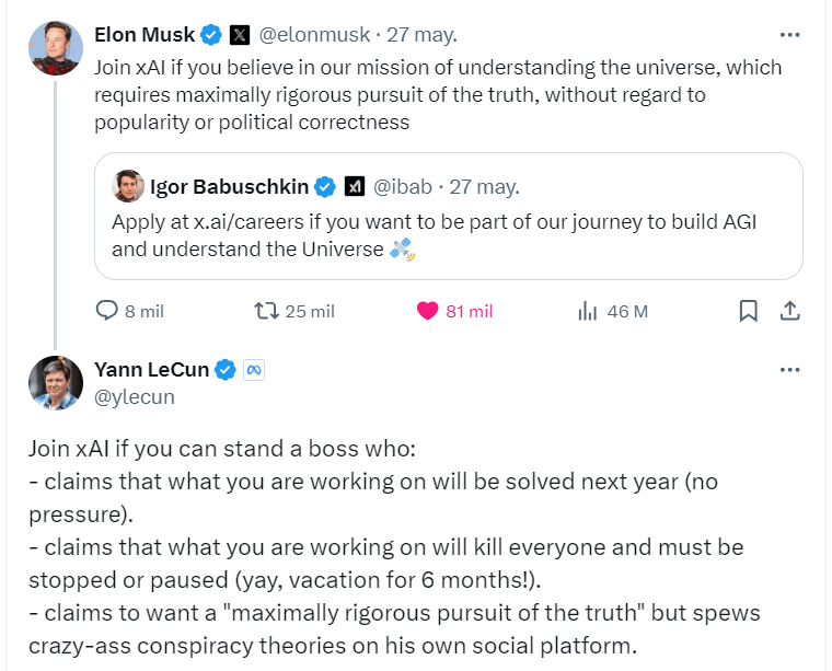 Over the last week we have witnessed an interesting (of course convoluted and heated) debate in X between two heavy weights of social media and influence. The 800++ pound “gorilla” owner, executive chairman, and CTO of X Corp, Elon Musk, against Vice-President and Chief AI Scientist at Meta, Yann LeCun.