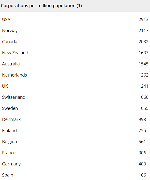 Next table lists the number of corporations per million population in the 1910 census of corporations compiled by Leslie Hannah. The countries listed had adopted impersonal rules for forming organizations, and they were the countries in which the productivity revolution of the late 19th century occurred. France, Belgium, and Germany are the borderline cases. (Next Spain 😉 )