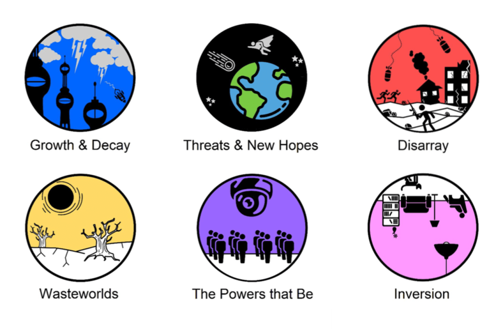 Fergnani & Song identify Six main archetypes from the fiction films which they name Growth & Decay, Threats & New Hopes, Waste worlds, The Powers that Be, Disarray, and Inversion.