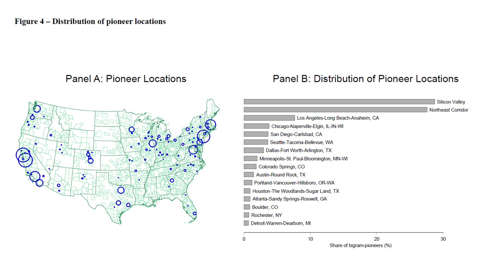 We identify phrases associated with novel technologies using textual analysis of patents, job postings, and earnings calls, enabling us to identify four stylized facts on the diffusion of jobs relating to new technologies. First, the development of economically impactful new technologies is geographically highly concentrated, more so even than overall patenting: 56% of the most economically impactful technologies come from just two U.S. locations, Silicon Valley and the Northeast Corridor. Second, as the technologies mature and the number of related jobs grows, hiring spreads geographically. But this process is very slow, taking around 50 years to disperse fully. Third, while initial hiring in new technologies is highly skill biased, over time the mean skill level in new positions declines, drawing in an increasing number of lower-skilled workers. Finally, the geographic spread of hiring is slowest for higher-skilled positions, with the locations where new technologies were pioneered remaining the focus for the technology’s high-skill jobs for decades.
