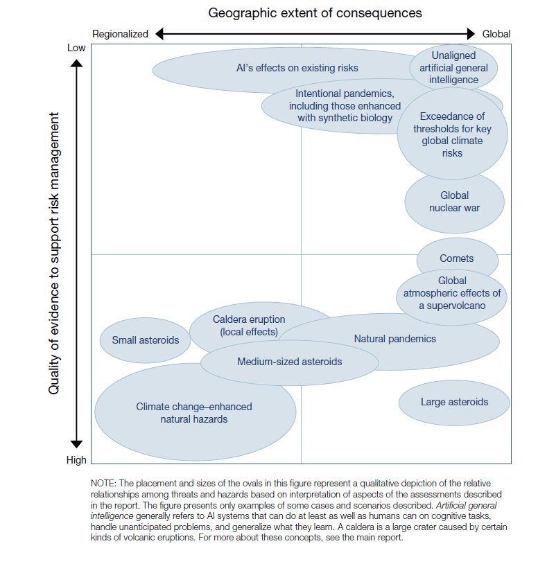 Climate change is one of the six threats and hazards they analyse: artificial intelligence; asteroid and comet impacts; sudden and severe changes to Earth’s climate; nuclear war; severe pandemics, whether resulting from naturally occurring events or from synthetic biology; and supervolcanoes.