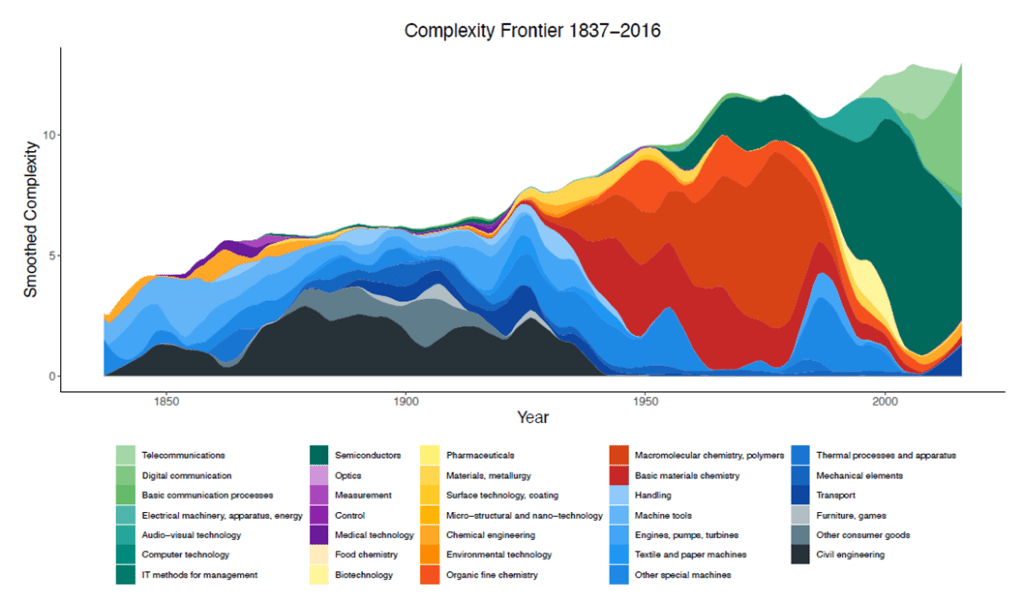 The US complexity2,3 frontier has moved upwards over time, indicating that the capabilities to invent and employ increasingly sophisticated technologies have been growing continuously. However, for the longest time, other factors than the capabilities in the most complex technologies were more important for the growth of the US economy.