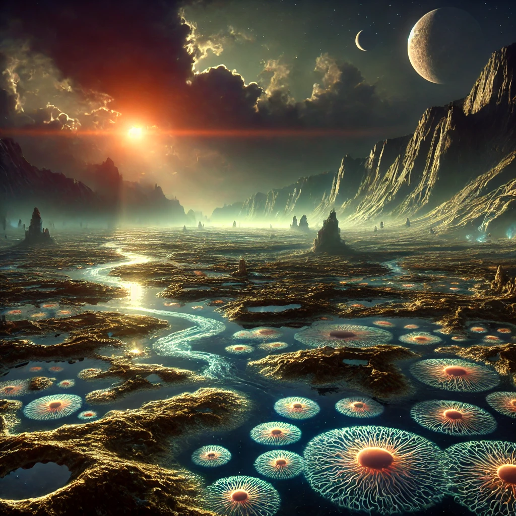 Featured Image: Fantasy sci-fi imagery of terraforming. Chatgpt4.0’s hallucination of early Earth with seeded biomaterial, jump starting Darwinian evolution. Included in the paper