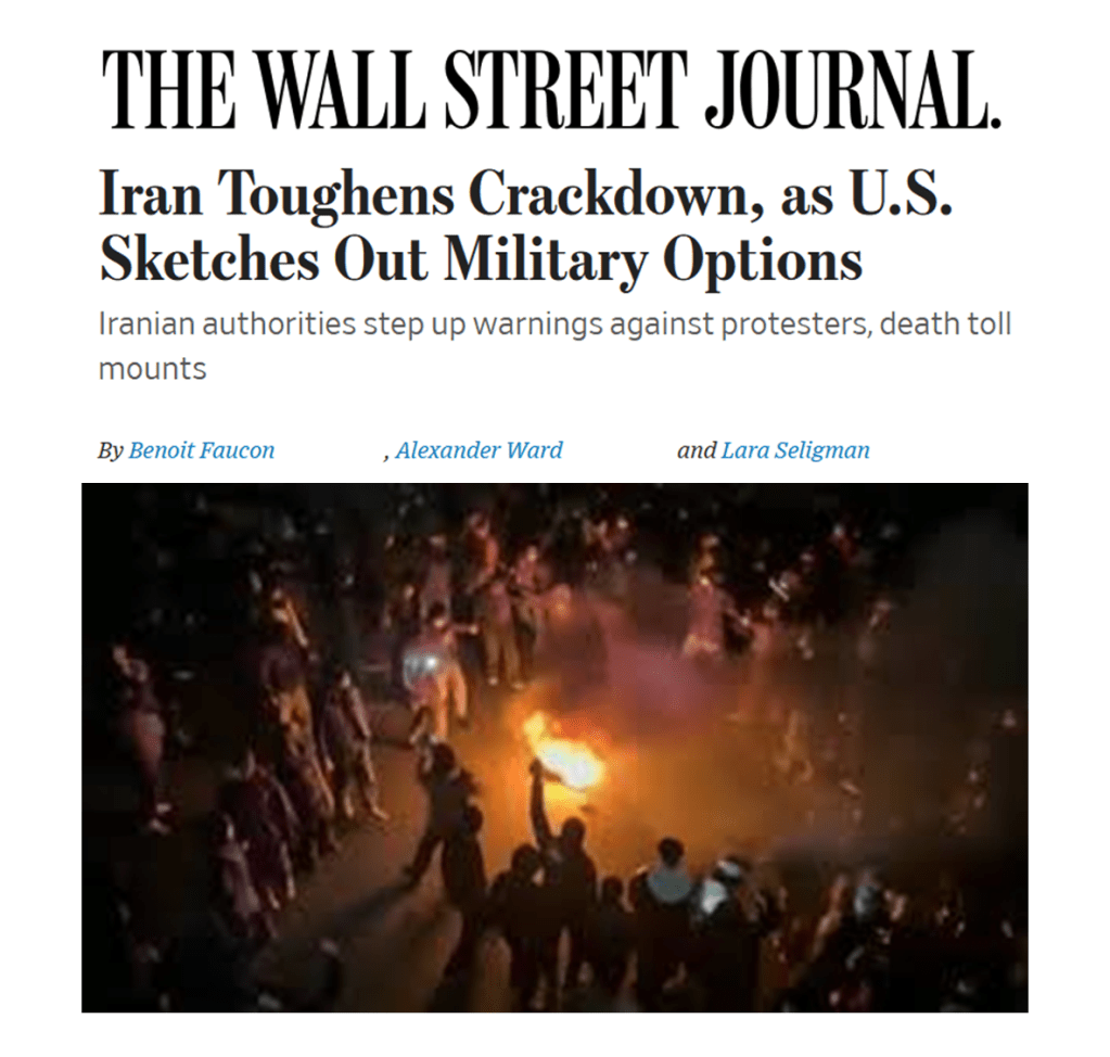 Iran Toughens Crackdown, as U.S. Sketches Out Military Options. Iranian authorities step up warnings against protesters, death toll mounts, WSJ