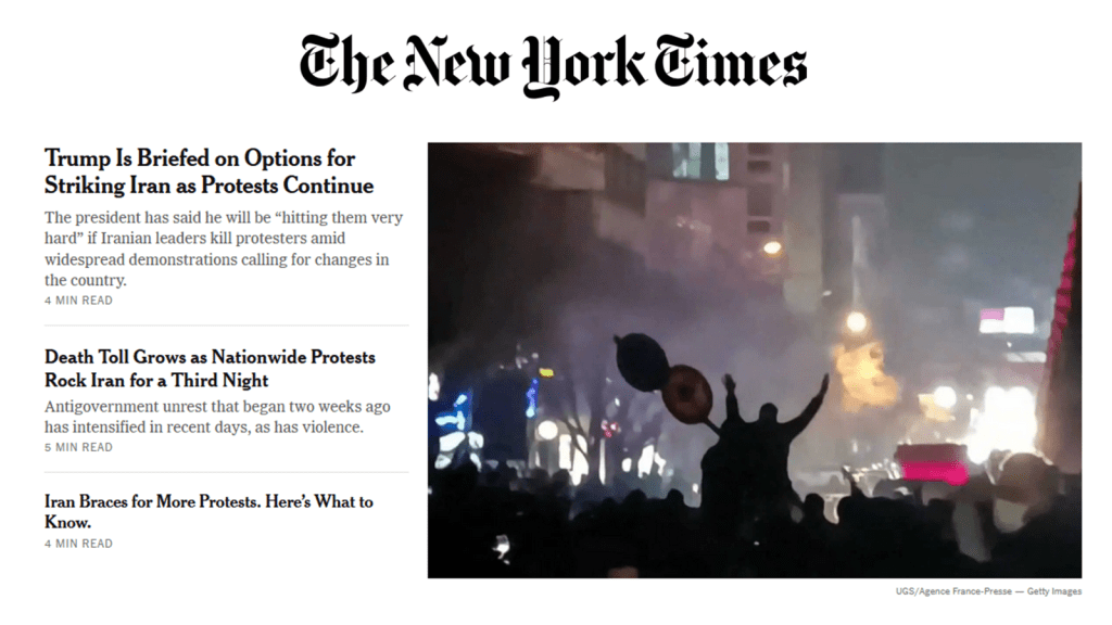 Trump Is Briefed on Options for Striking Iran as Protests Continue. The president has said he will be “hitting them very hard” if Iranian leaders kill protesters amid widespread demonstrations calling for wholesale changes in the country. NYT