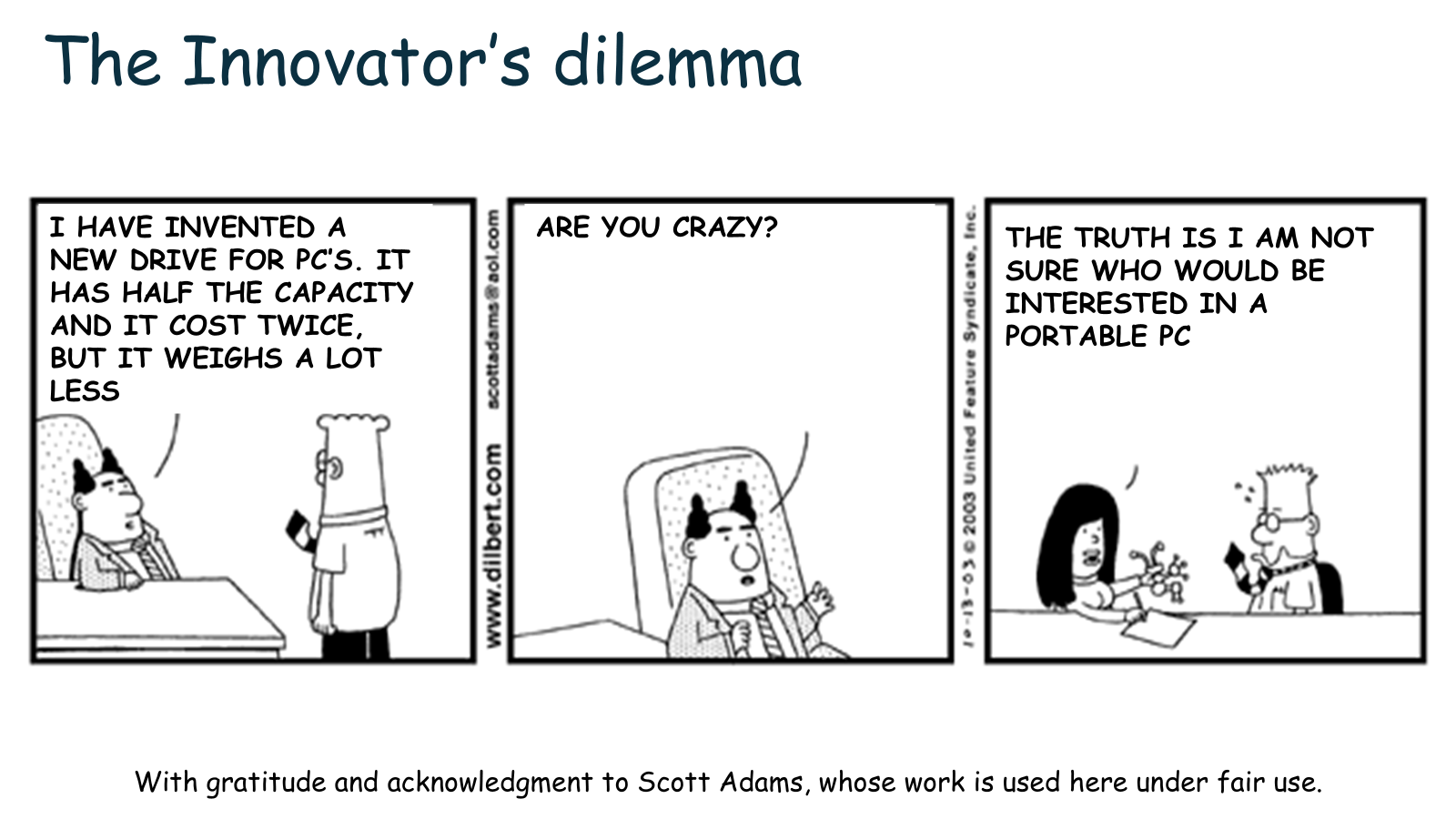 Scott Adams published his first business book, The Dilbert Principle, in 1996. Clayton Christensen released The Innovator’s Dilemma in 1997.